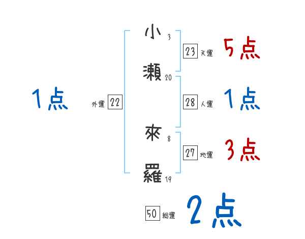 天運![]() | 小瀬來羅さんの天運は23画の5つ星!想像力に優れ活力がある。一代で成功し名誉を手に入れる。 家系が持つ宿命的な運勢を表します。祖先から受け継いだ苗字ですので自分の力が及びません。家柄を象徴します。 |