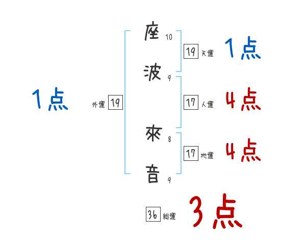 天運![]() | 座波來音さんの天運は19画の1つ星!優れた才能を持ちますが、協調性が足りないことも。周りの人と協力する事を意識しましょう。 家系が持つ宿命的な運勢を表します。祖先から受け継いだ苗字ですので自分の力が及びません。家柄を象徴します。 |