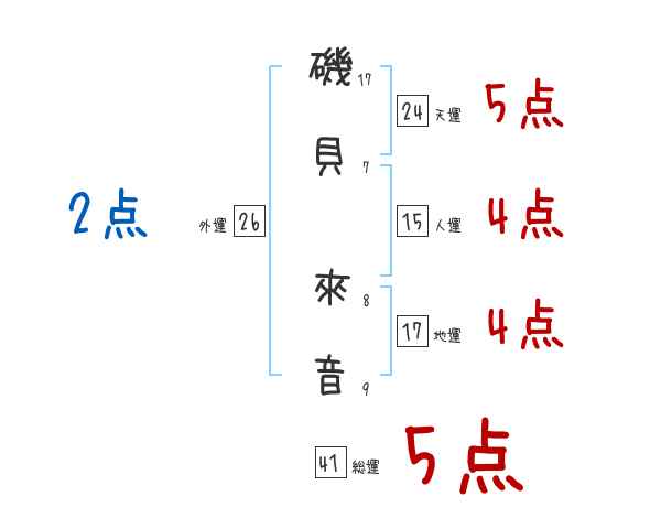 外運![]() | 磯貝來音さんの外運は26画の2つ星!波瀾万丈かも。信頼できる人を大事にしましょう。 生活面を象徴する運勢です。外部から受ける影響力を表し、結婚運、家庭運や職場、環境への順応性を表します。 |