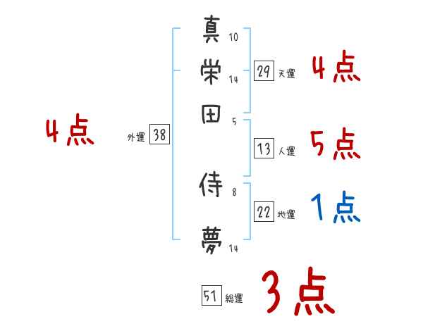 人運![]() | 真栄田侍夢さんの人運は13画の5つ星!才能に恵まれ人気がある。名声を手に入れる。円満な人生。 性格や才能などを表す2番目に重要な運勢です。人間関係や協調性、社会的な成功に影響します。主に20歳から50歳ぐらいまでの中年期の運勢を表します。 |