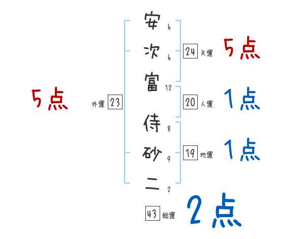 天運![]() | 安次富侍砂二さんの天運は24画の5つ星!家庭運が良く順調な人生。金運にも恵まれる。 家系が持つ宿命的な運勢を表します。祖先から受け継いだ苗字ですので自分の力が及びません。家柄を象徴します。 |