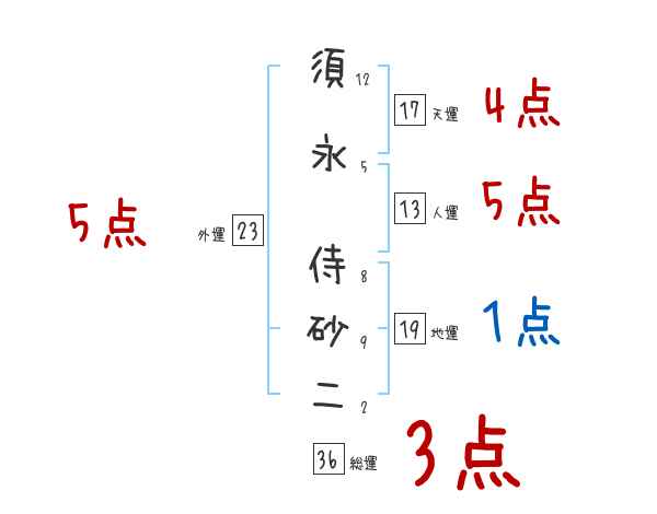 人運![]() | 須永侍砂二さんの人運は13画の5つ星!才能に恵まれ人気がある。名声を手に入れる。円満な人生。 性格や才能などを表す2番目に重要な運勢です。人間関係や協調性、社会的な成功に影響します。主に20歳から50歳ぐらいまでの中年期の運勢を表します。 |