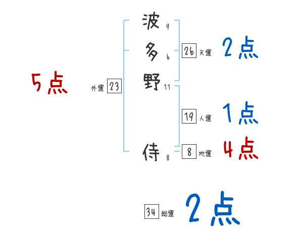 総運![]() | 波多野侍さんの総運は34画の2つ星!独創性に優れるが、自尊心が強く災難に注意しましょう。 あなたの人生を表す1番重要な運勢です。生涯を通じて影響する総合運となり、主に50歳以降の晩年期に影響を及ぼします。 |