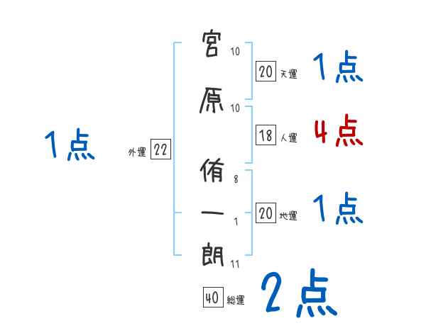 外運![]() | 宮原侑一朗さんの外運は22画の1つ星!努力することが苦手ないっぽう手先が器用。芸術性にも優れる。 生活面を象徴する運勢です。外部から受ける影響力を表し、結婚運、家庭運や職場、環境への順応性を表します。 |