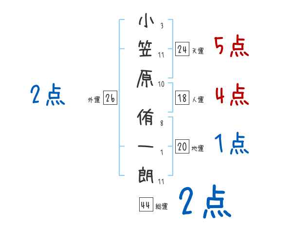 外運![]() | 小笠原侑一朗さんの外運は26画の2つ星!波瀾万丈かも。信頼できる人を大事にしましょう。 生活面を象徴する運勢です。外部から受ける影響力を表し、結婚運、家庭運や職場、環境への順応性を表します。 |