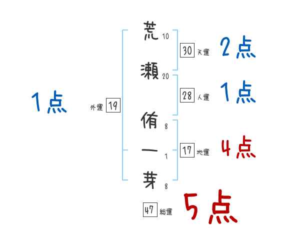総運![]() | 荒瀬侑一芽さんの総運は47画の5つ星!実力が開花し発展する円満な人生。財に恵まれる。 あなたの人生を表す1番重要な運勢です。生涯を通じて影響する総合運となり、主に50歳以降の晩年期に影響を及ぼします。 |