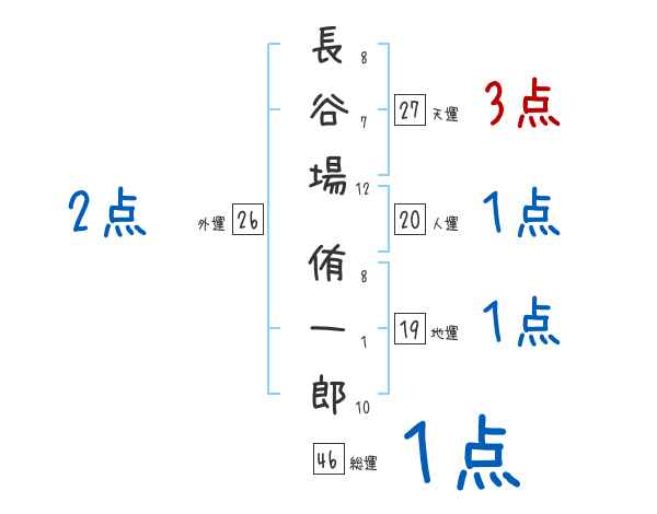 外運![]() | 長谷場侑一郎さんの外運は26画の2つ星!波瀾万丈かも。信頼できる人を大事にしましょう。 生活面を象徴する運勢です。外部から受ける影響力を表し、結婚運、家庭運や職場、環境への順応性を表します。 |