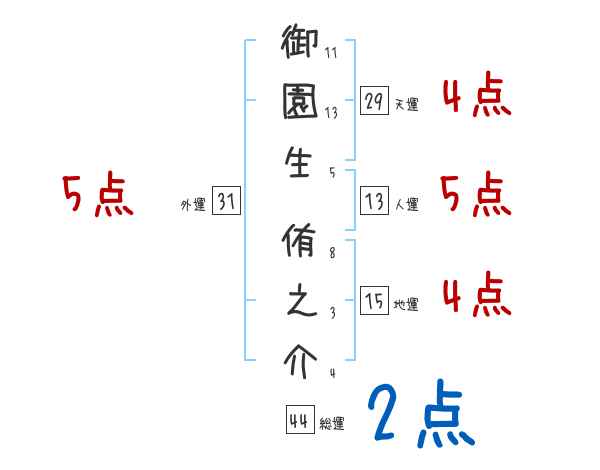 総運![]() | 御園生侑之介さんの総運は44画の2つ星!誠実で慎重な性格。物事を考えすぎないように注意しましょう。 あなたの人生を表す1番重要な運勢です。生涯を通じて影響する総合運となり、主に50歳以降の晩年期に影響を及ぼします。 |