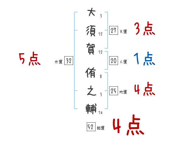 外運![]() | 大須賀侑之輔さんの外運は32画の5つ星!柔軟性があり成功する。チャンスが多く金運が良い。 生活面を象徴する運勢です。外部から受ける影響力を表し、結婚運、家庭運や職場、環境への順応性を表します。 |