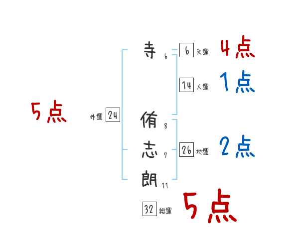 総運![]() | 寺侑志朗さんの総運は32画の5つ星!柔軟性があり成功する。チャンスが多く金運が良い。 あなたの人生を表す1番重要な運勢です。生涯を通じて影響する総合運となり、主に50歳以降の晩年期に影響を及ぼします。 |