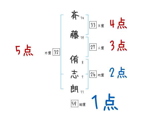 外運![]() | 斉藤侑志朗さんの外運は32画の5つ星!柔軟性があり成功する。チャンスが多く金運が良い。 生活面を象徴する運勢です。外部から受ける影響力を表し、結婚運、家庭運や職場、環境への順応性を表します。 |
