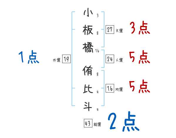 外運![]() | 小板橋侑比斗さんの外運は19画の1つ星!優れた才能を持ちますが、協調性が足りないことも。周りの人と協力する事を意識しましょう。 生活面を象徴する運勢です。外部から受ける影響力を表し、結婚運、家庭運や職場、環境への順応性を表します。 |