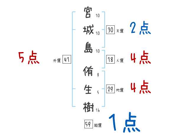 外運![]() | 宮城島侑生樹さんの外運は41画の5つ星!大志を抱き、目標に向かって実力を発揮し達成する。温和な性格。 生活面を象徴する運勢です。外部から受ける影響力を表し、結婚運、家庭運や職場、環境への順応性を表します。 |