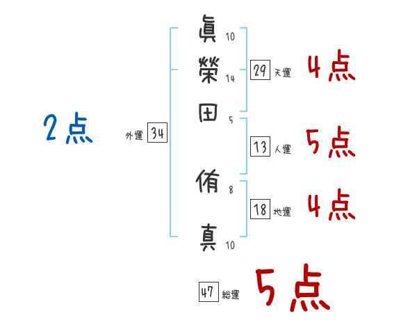 人運![]() | 眞榮田侑真さんの人運は13画の5つ星!才能に恵まれ人気がある。名声を手に入れる。円満な人生。 性格や才能などを表す2番目に重要な運勢です。人間関係や協調性、社会的な成功に影響します。主に20歳から50歳ぐらいまでの中年期の運勢を表します。 |
