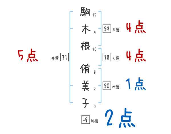 外運![]() | 駒木根侑美子さんの外運は31画の5つ星!社交性があり判断力に優れる。順風満帆な人生で円満な生活。 生活面を象徴する運勢です。外部から受ける影響力を表し、結婚運、家庭運や職場、環境への順応性を表します。 |