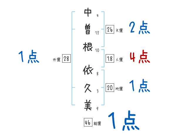 天運![]() | 中曽根依久美さんの天運は26画の2つ星!波瀾万丈かも。信頼できる人を大事にしましょう。 家系が持つ宿命的な運勢を表します。祖先から受け継いだ苗字ですので自分の力が及びません。家柄を象徴します。 |