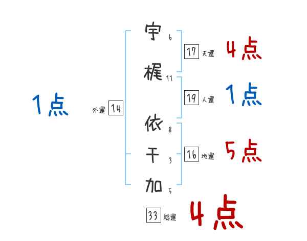 | 外運  | 宇梶依千加さんの外運は14画の1つ星!人に対して優しいがストレスを溜め込みがち。人間関係のトラブルを避けるよう気をつけましょう。生活面を象徴する運勢です。外部から受ける影響力を表し、結婚運、家庭運や職場、環境への順応性を表します。 |