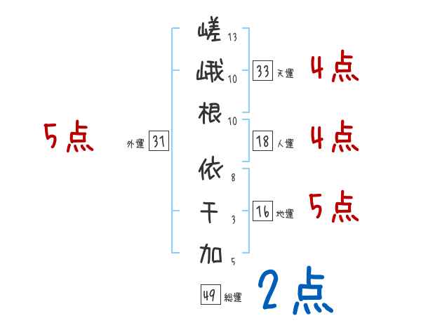 天運![]() | 嵯峨根依千加さんの天運は33画の4つ星!権力志向でプライドが高い。勇気があり運を切り開き成功する。 家系が持つ宿命的な運勢を表します。祖先から受け継いだ苗字ですので自分の力が及びません。家柄を象徴します。 |
