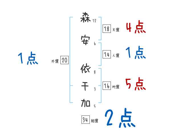 | 総運  | 森安依千加さんの総運は34画の2つ星!独創性に優れるが、自尊心が強く災難に注意しましょう。あなたの人生を表す1番重要な運勢です。生涯を通じて影響する総合運となり、主に50歳以降の晩年期に影響を及ぼします。 |