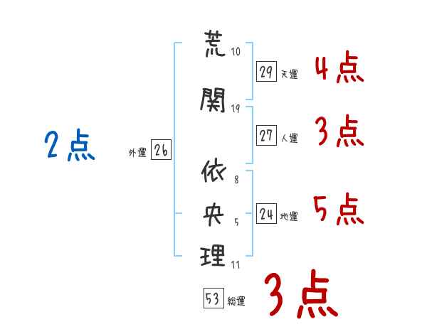 天運![]() | 荒関依央理さんの天運は29画の4つ星!完全主義で才能がある。厳格な心の持ち主。 家系が持つ宿命的な運勢を表します。祖先から受け継いだ苗字ですので自分の力が及びません。家柄を象徴します。 |