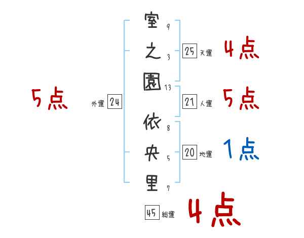 総運![]() | 室之園依央里さんの総運は45画の4つ星!もくもくと物事を進め達成する。地味な努力家。 あなたの人生を表す1番重要な運勢です。生涯を通じて影響する総合運となり、主に50歳以降の晩年期に影響を及ぼします。 |