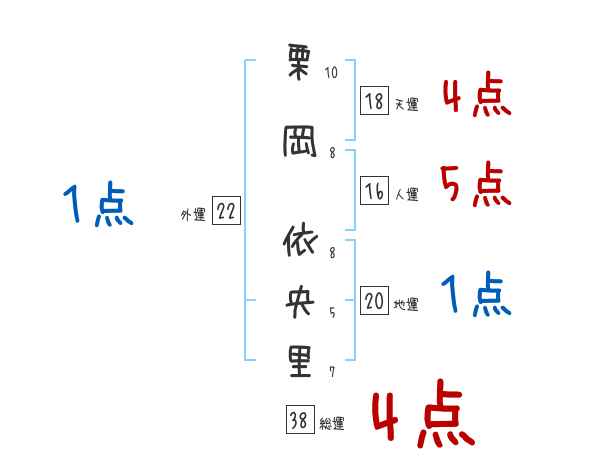 天運![]() | 栗岡依央里さんの天運は18画の4つ星!情熱的で剛気。忍耐力があり信頼される。 家系が持つ宿命的な運勢を表します。祖先から受け継いだ苗字ですので自分の力が及びません。家柄を象徴します。 |