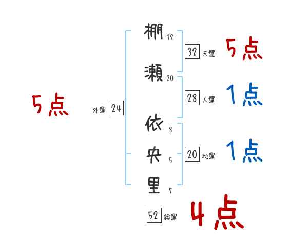 天運![]() | 棚瀬依央里さんの天運は32画の5つ星!柔軟性があり成功する。チャンスが多く金運が良い。 家系が持つ宿命的な運勢を表します。祖先から受け継いだ苗字ですので自分の力が及びません。家柄を象徴します。 |