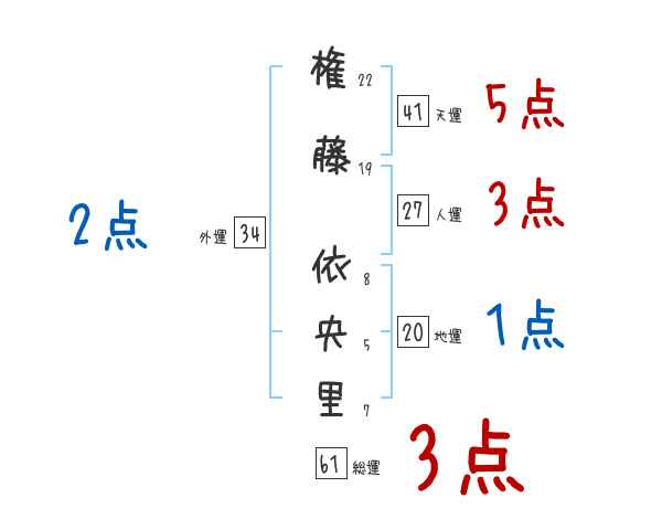 天運![]() | 権藤依央里さんの天運は41画の5つ星!大志を抱き、目標に向かって実力を発揮し達成する。温和な性格。 家系が持つ宿命的な運勢を表します。祖先から受け継いだ苗字ですので自分の力が及びません。家柄を象徴します。 |
