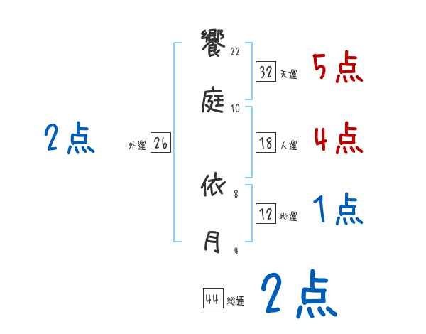 総運![]() | 饗庭依月さんの総運は44画の2つ星!誠実で慎重な性格。物事を考えすぎないように注意しましょう。 あなたの人生を表す1番重要な運勢です。生涯を通じて影響する総合運となり、主に50歳以降の晩年期に影響を及ぼします。 |
