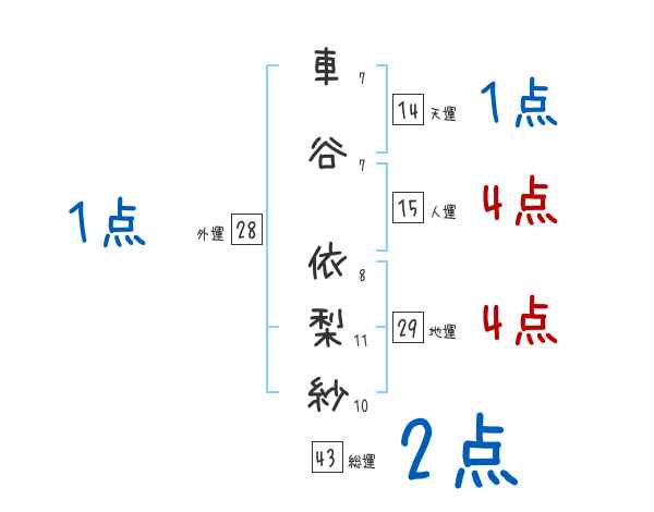 外運![]() | 車谷依梨紗さんの外運は28画の1つ星!家庭環境に注意。スポーツで活躍できる能力があるかも。 生活面を象徴する運勢です。外部から受ける影響力を表し、結婚運、家庭運や職場、環境への順応性を表します。 |