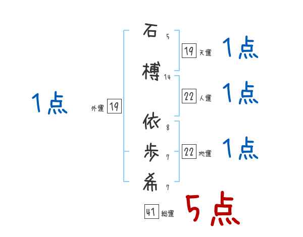 地運![]() | 石榑依歩希さんの地運は22画の1つ星!努力することが苦手ないっぽう手先が器用。芸術性にも優れる。 個性を表す基礎的な運勢です。性格形成や対人関係、行動力など家庭環境に影響されます。主に誕生してから20歳くらいまでの若年期の運勢を表します。 |