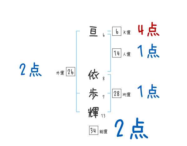外運![]() | 亘依歩輝さんの外運は26画の2つ星!波瀾万丈かも。信頼できる人を大事にしましょう。 生活面を象徴する運勢です。外部から受ける影響力を表し、結婚運、家庭運や職場、環境への順応性を表します。 |