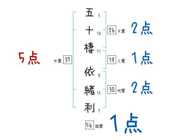 総運![]() | 五十棲依緒利さんの総運は56画の1つ星!消極的で無気力になりがち。誠実な気持ちが必要でしょう。 あなたの人生を表す1番重要な運勢です。生涯を通じて影響する総合運となり、主に50歳以降の晩年期に影響を及ぼします。 |
