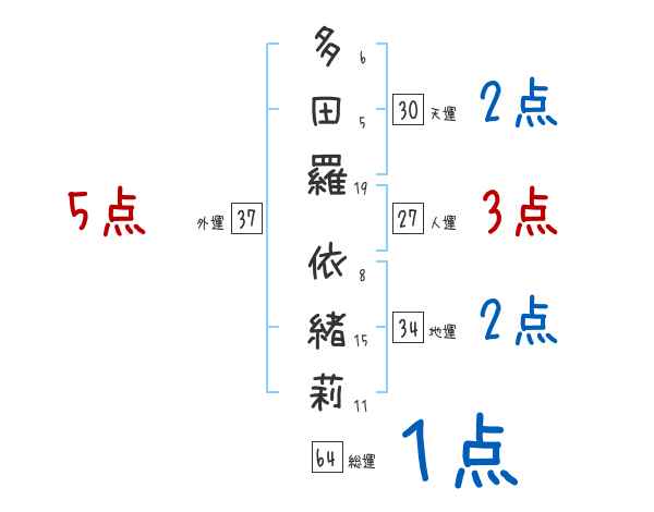 天運![]() | 多田羅依緒莉さんの天運は30画の2つ星!浮き沈みの激しさに注意しましょう。 家系が持つ宿命的な運勢を表します。祖先から受け継いだ苗字ですので自分の力が及びません。家柄を象徴します。 |