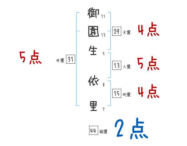 総運![]() | 御園生依里さんの総運は44画の2つ星!誠実で慎重な性格。物事を考えすぎないように注意しましょう。 あなたの人生を表す1番重要な運勢です。生涯を通じて影響する総合運となり、主に50歳以降の晩年期に影響を及ぼします。 |