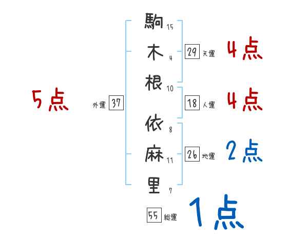 天運![]() | 駒木根依麻里さんの天運は29画の4つ星!完全主義で才能がある。厳格な心の持ち主。 家系が持つ宿命的な運勢を表します。祖先から受け継いだ苗字ですので自分の力が及びません。家柄を象徴します。 |