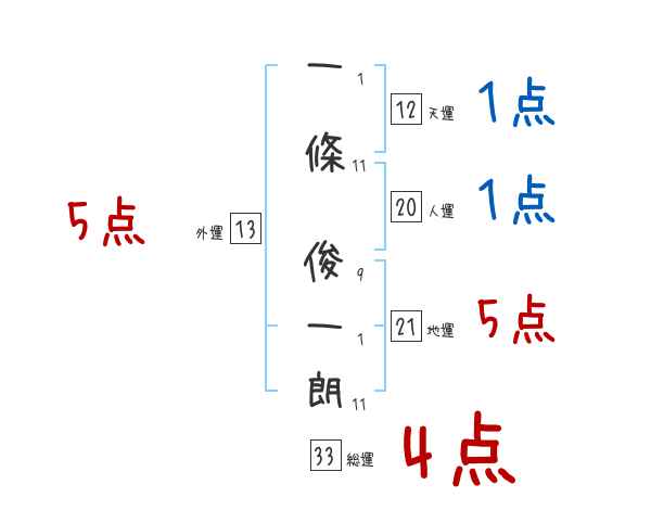 天運![]() | 一條俊一朗さんの天運は12画の1つ星!簡単な失敗で諦めてしまいやすいかも。着実に行動すると良いでしょう。 家系が持つ宿命的な運勢を表します。祖先から受け継いだ苗字ですので自分の力が及びません。家柄を象徴します。 |