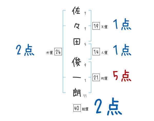 外運![]() | 佐々田俊一朗さんの外運は26画の2つ星!波瀾万丈かも。信頼できる人を大事にしましょう。 生活面を象徴する運勢です。外部から受ける影響力を表し、結婚運、家庭運や職場、環境への順応性を表します。 |