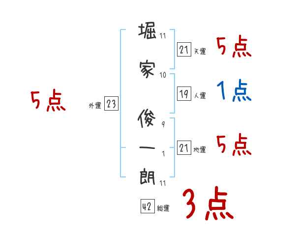 天運![]() | 堀家俊一朗さんの天運は21画の5つ星!統率力がある。独立し成功する。名誉を手に入れる。 家系が持つ宿命的な運勢を表します。祖先から受け継いだ苗字ですので自分の力が及びません。家柄を象徴します。 |