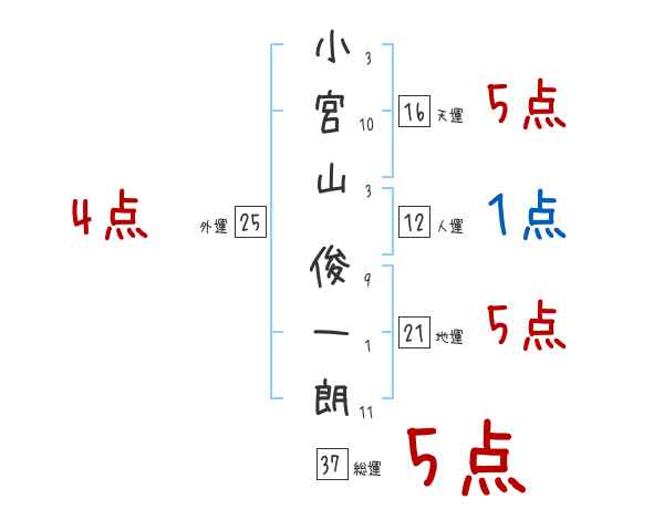 天運![]() | 小宮山俊一朗さんの天運は16画の5つ星!人望が厚く大きく発展する。逆転成功が見える。 家系が持つ宿命的な運勢を表します。祖先から受け継いだ苗字ですので自分の力が及びません。家柄を象徴します。 |