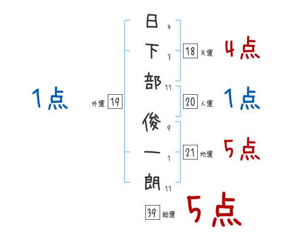 天運![]() | 日下部俊一朗さんの天運は18画の4つ星!情熱的で剛気。忍耐力があり信頼される。 家系が持つ宿命的な運勢を表します。祖先から受け継いだ苗字ですので自分の力が及びません。家柄を象徴します。 |