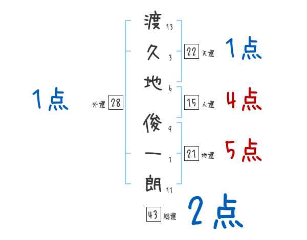 地運![]() | 渡久地俊一朗さんの地運は21画の5つ星!統率力がある。独立し成功する。名誉を手に入れる。 個性を表す基礎的な運勢です。性格形成や対人関係、行動力など家庭環境に影響されます。主に誕生してから20歳くらいまでの若年期の運勢を表します。 |