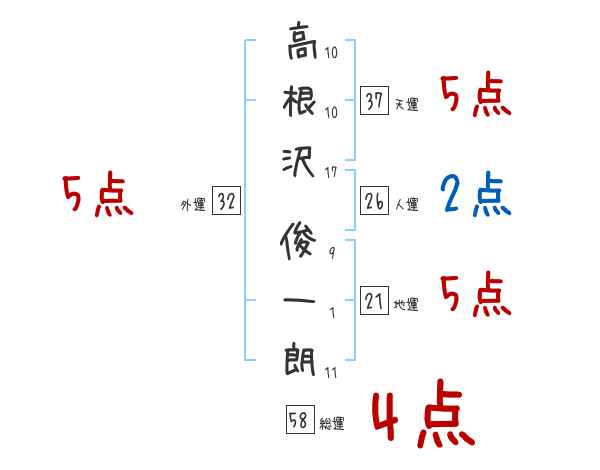 外運![]() | 高根沢俊一朗さんの外運は32画の5つ星!柔軟性があり成功する。チャンスが多く金運が良い。 生活面を象徴する運勢です。外部から受ける影響力を表し、結婚運、家庭運や職場、環境への順応性を表します。 |