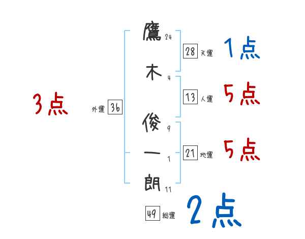 外運![]() | 鷹木俊一朗さんの外運は36画の3つ星!先見性が豊かです。多少神経質で苦労することも。 生活面を象徴する運勢です。外部から受ける影響力を表し、結婚運、家庭運や職場、環境への順応性を表します。 |
