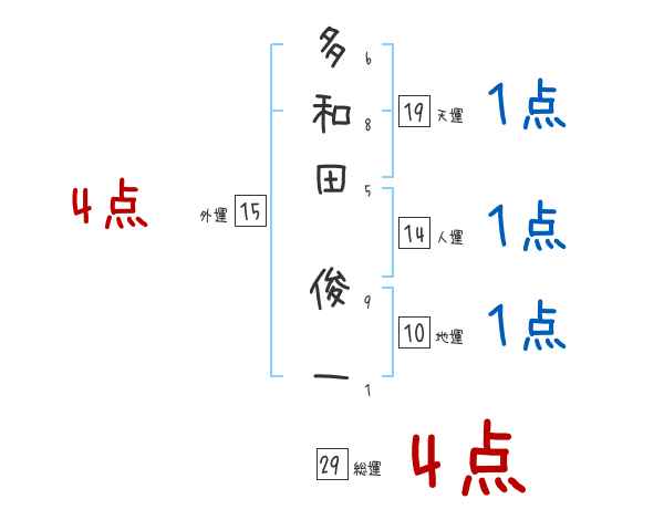 外運![]() | 多和田俊一さんの外運は15画の4つ星!人徳があり出世する。順調に物事を進め円満な人生。 生活面を象徴する運勢です。外部から受ける影響力を表し、結婚運、家庭運や職場、環境への順応性を表します。 |