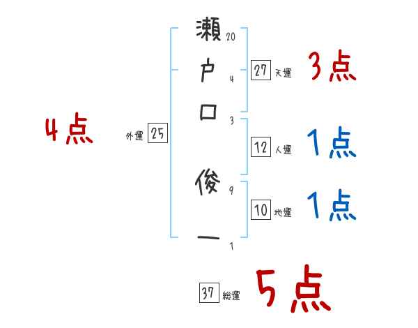 天運![]() | 瀬戸口俊一さんの天運は27画の3つ星!頭脳明晰だが強情で摩擦が多い傾向。孤立に注意。 家系が持つ宿命的な運勢を表します。祖先から受け継いだ苗字ですので自分の力が及びません。家柄を象徴します。 |