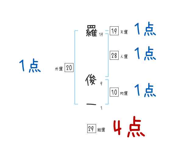 天運![]() | 羅俊一さんの天運は19画の1つ星!優れた才能を持ちますが、協調性が足りないことも。周りの人と協力する事を意識しましょう。 家系が持つ宿命的な運勢を表します。祖先から受け継いだ苗字ですので自分の力が及びません。家柄を象徴します。 |