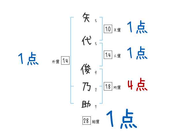 総運![]() | 矢代俊乃助さんの総運は28画の1つ星!家庭環境に注意。スポーツで活躍できる能力があるかも。 あなたの人生を表す1番重要な運勢です。生涯を通じて影響する総合運となり、主に50歳以降の晩年期に影響を及ぼします。 |
