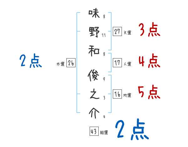 天運![]() | 味野和俊之介さんの天運は27画の3つ星!頭脳明晰だが強情で摩擦が多い傾向。孤立に注意。 家系が持つ宿命的な運勢を表します。祖先から受け継いだ苗字ですので自分の力が及びません。家柄を象徴します。 |