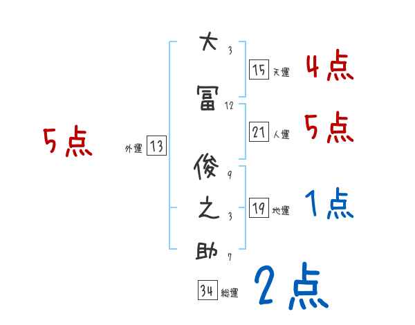 人運![]() | 大冨俊之助さんの人運は21画の5つ星!統率力がある。独立し成功する。名誉を手に入れる。 性格や才能などを表す2番目に重要な運勢です。人間関係や協調性、社会的な成功に影響します。主に20歳から50歳ぐらいまでの中年期の運勢を表します。 |